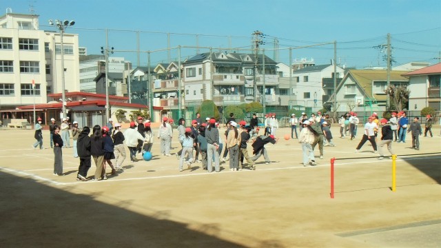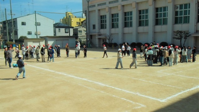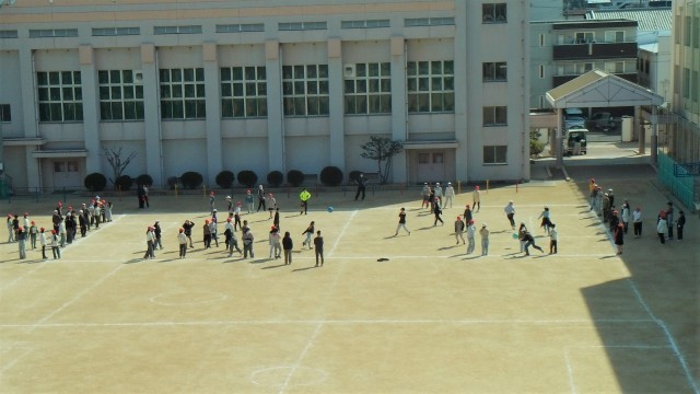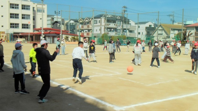6年生全体で運動場でドッジボールをしていました。
