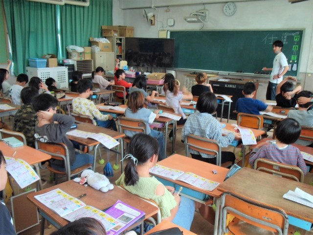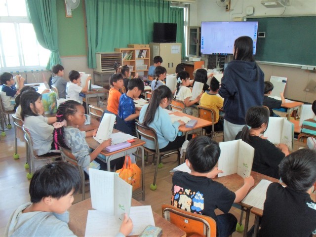 1組は新出漢字の学習をしていました。2組は国語で両手で教科書を持って音読をしていました。