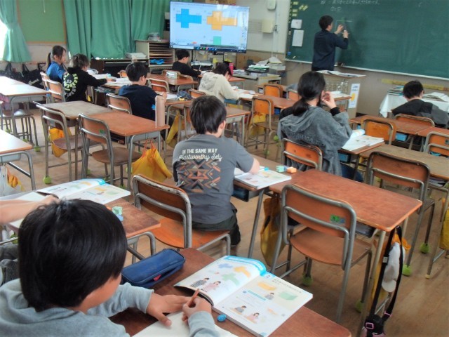 1組、2組、分割教室の3つのクラスに分かれて算数の「立体」の学習をしていました。