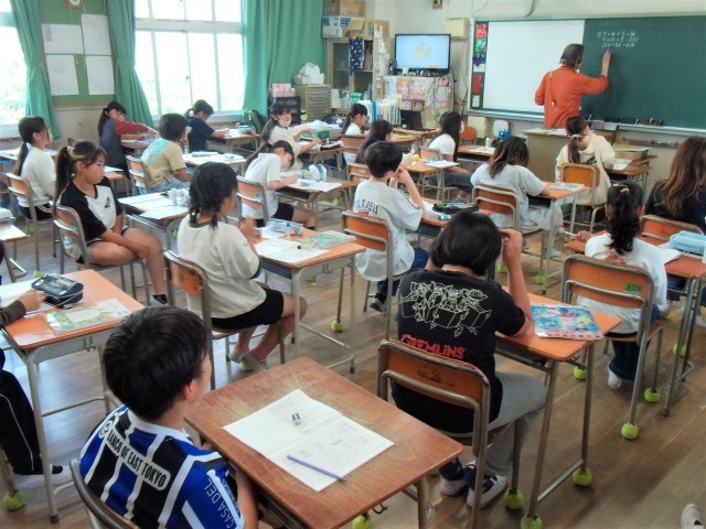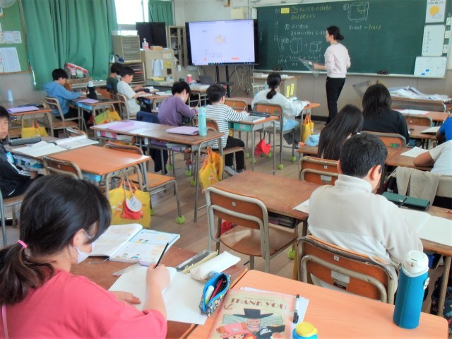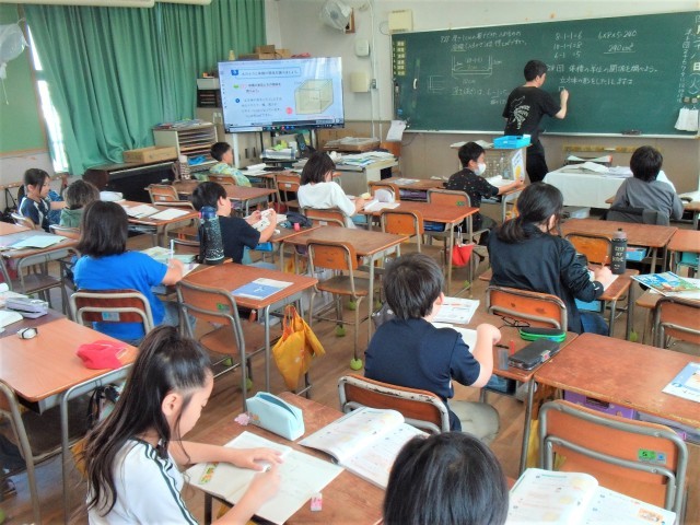 分割教室、1組、2組の3クラスで算数の「体積」の学習をしていました。