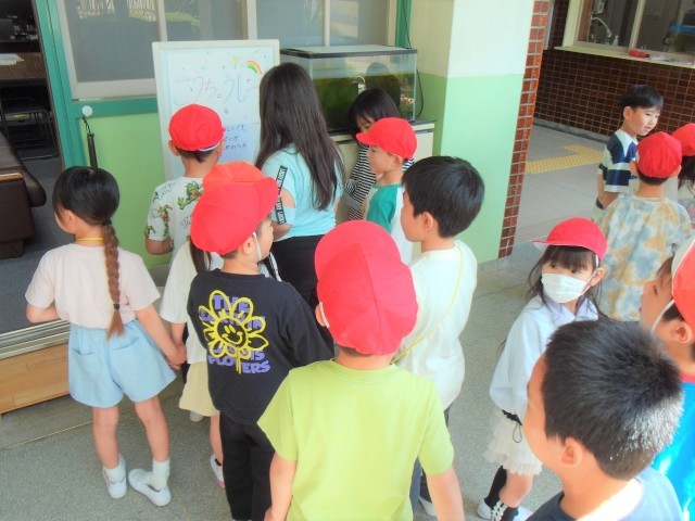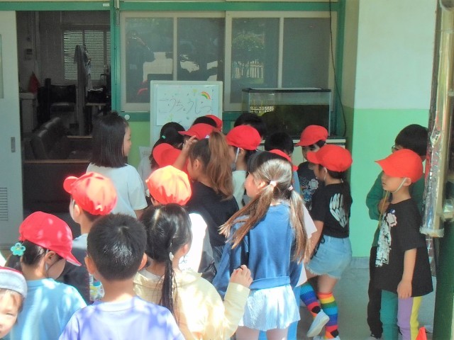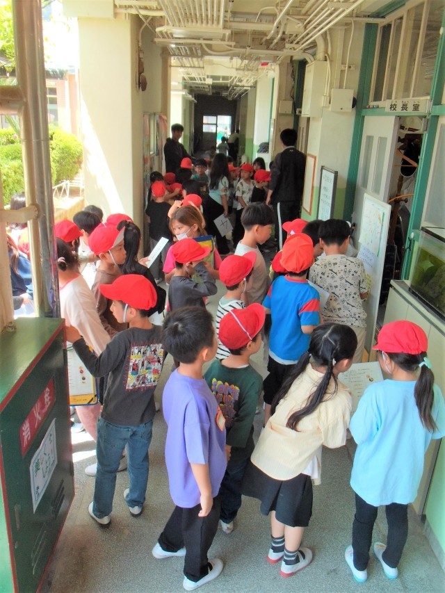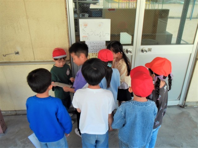 1年生と2年生が「学校たんけん」をしていまいした。2年生が1年生を連れて、仲よく、学校のいろいろな場所をたんけんしました。それぞれの場所の名前と紹介を、2年生が1年生に教えてあげていました。