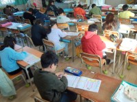 1組は、朝の会の時間に、みんなで楽しそうに学級通信を読んでいました。2国は、1時間目に算数の「なんじなんぷん」のテストをしていました。