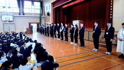 最初に、3月末に学校を去った教職員と4月から新たに加わる教職員の紹介がありました。次に、校長先生のお話があり、その中で、昨年度に子どもたちと一緒に決めたスローガン「未来へつなごう!一人ひとりが生きる楽しい学校」を目指して今年度も取り組んでいくことを子どもたちに呼びかけました。その後、生活指導担当者から1学期の学校生活についてのお話、みんなで元気いっぱいに校歌を歌った後、子どもたちがお待ちかねの担任の先生の発表&教職員の紹介がありました。司会者から事前に「何があってもお話をしないように…」と言われていたこともあって、子どもたちは内心、“dokidoki”“wakuwaku”しながらも、感情をグッと抑えて担任の先生の発表を聞いていました。