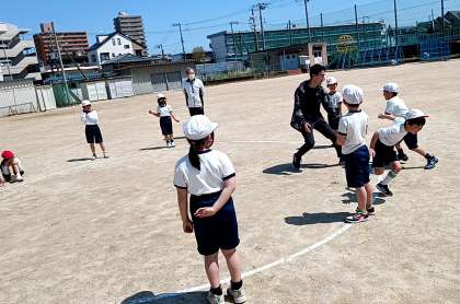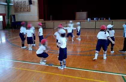2年生は運動場と講堂に分かれて、元気に体育の学習です。運動場では鬼ごっこ、講堂では、全身を使って楽しくジャンケンをしていました。
