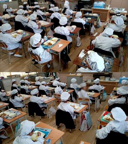 準備が整った後は、大きな声で「いただきます!」。給食が始まって3日目ですが、今日までほとんど残食がなく、みんながんばって食べています。