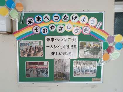 体育館前の掲示板には、本校のスローガンである「未来へつなごう!一人ひとりが生きる楽しい学校」が掲げられていました。そして、満開の桜と初々しい1年生の子どもたちの写真がスローガンの周りを囲んでいます。