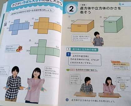 4/19 5年 算数科 公開日 2024/04/19 更新日 2024/04/19 お知らせ 5年生の算数は「直方体や立方体のかさを表そう(体積)」の学習です。直方体や立方体の体積を比べる方法を考えていました。 グループに分かれて、教科書から切り取った直方体と立方体に、一辺が1センチメートルの木片(立方体)を敷き詰めていましたが、みんな真剣な表情で黙々と作業に取り組んでいました。 いいね(0)