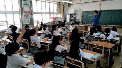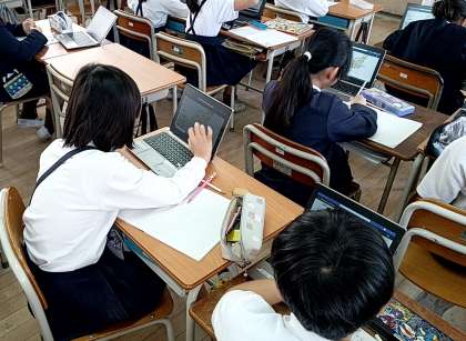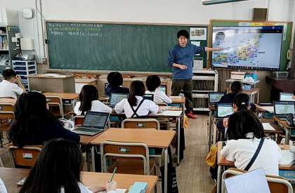 4年生の社会は「日本の47都道府県について考えよう」です。タブレットで日本地図を見ながら、7つの地方別に都道府県を確認していました。