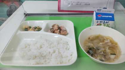 今日の献立は ・さけのごまみそ焼き ・五目汁 ・えんどうの卵とじ ・ごはん ・牛乳 です。