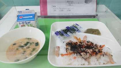 今日の献立は ・かやくご飯 ・きざみのり ・みそ汁 ・まっ茶ういろう ・牛乳 です。