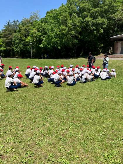 遠足ウィーク最終日は、3・4年生です。ただいま、目的地の錦織公園に着いて昼食前の活動中です。