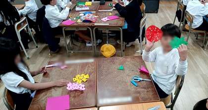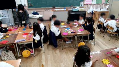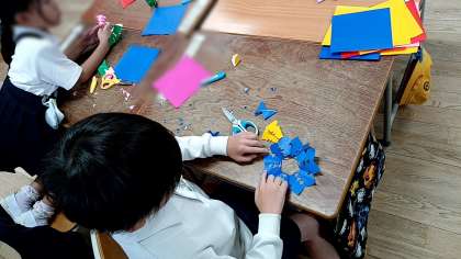 1年生図工の学習のようすです。折り紙を使って飾りを作っていました。折り方や切り方を工夫しながら、開くと連続した模様になるような飾りを作っていました。