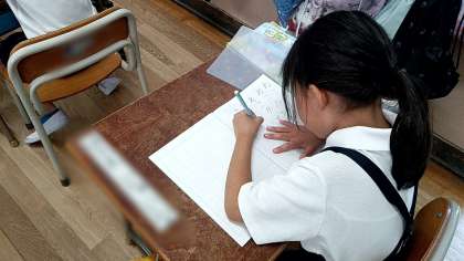 ひと通りひらがなを学習した子どもたちの次の課題は文を書くことです。「〇〇が△△する」という文を作るために、先ずは教科書の例文をしっかりとノートに写していました。