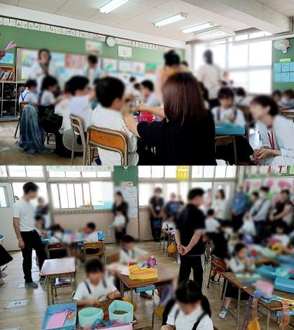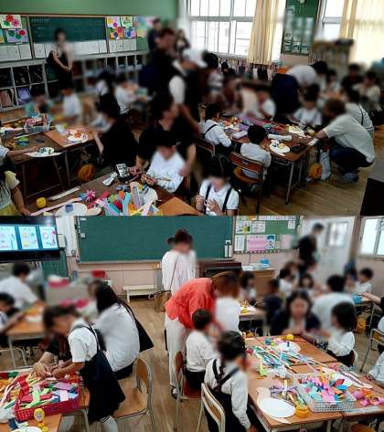 写真上は1年生の図工「おしゃれなかたつむり」、下は2年生「わっかでへんしん」です。
