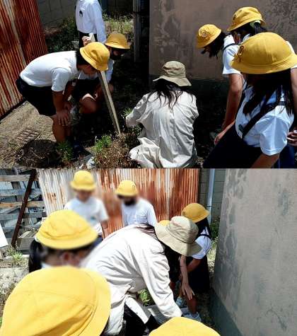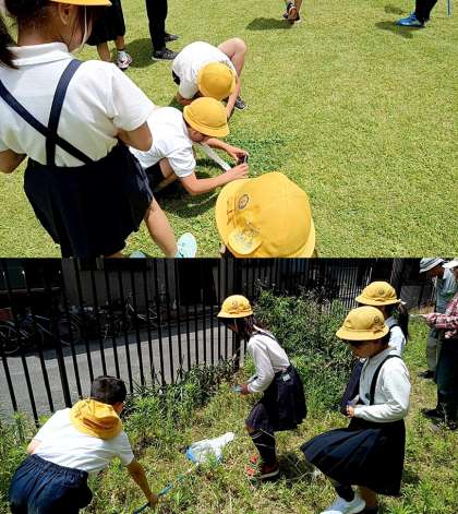 3時間目は講師の方の簡単な説明の後、子どもたちは4つのグループに分かれ、中庭や学習園、普段立ち入ることが少ない理科室裏へ行って、虫や植物を探しました。生き物を探しているときの子どもたちの生き生きとした姿がとても印象に残りました。