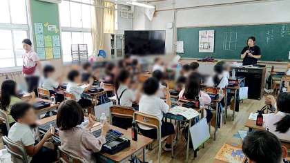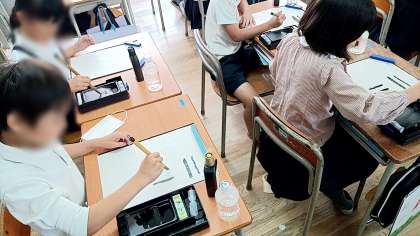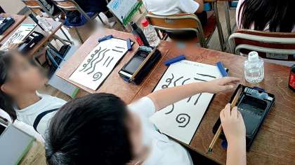 6/14 3年 書写 公開日 2024/06/14 更新日 2024/06/14 お知らせ 3年生の書写は、初めての毛筆の学習、すなわち「筆おろし」でした。 子どもたちは、習字の時間の約束事や筆の持ち方、書くときの姿勢などを確認してから、真新しい筆の先を手でほぐし、硯に初めて墨汁を入れ、筆に墨をつけてから練習用紙に直線や曲線を書きました。 初めて筆を持った子どもたちは少し緊張気味で、まるで恐々と書いているようだったのが印象的でした。 いいね(0)