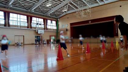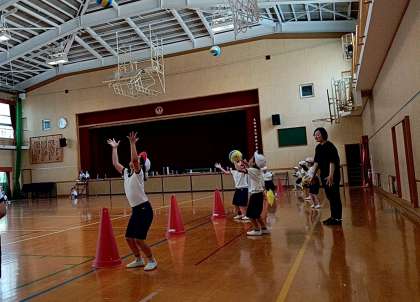 子どもたちは、向かいのカラーコーンまで走って、ボールを投げたり取ったりして楽しく体を動かしていました。