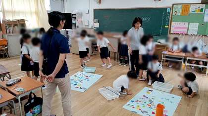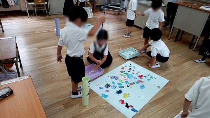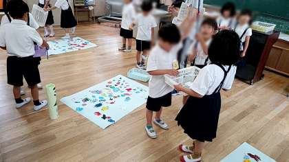 各学級とも準備期間は今日を入れてあと二日。この日は1年生が「さかなつり」の店番の練習をしていました。受付やルール説明、お客さんのお手伝いなどのお仕事を、お客さん役の子に対して実際に試していました。