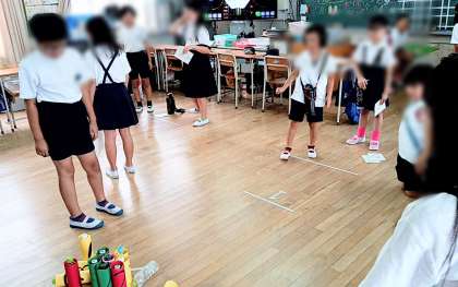 上の写真は1組の「的当て(まとあて)」で、下は2組の「ポイポイモルック」(モルック〈ペットボトル〉を投げて、倒れたスキットル〈ピン:ペットボトル〉の合計点数を競うゲーム)です。