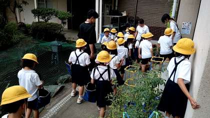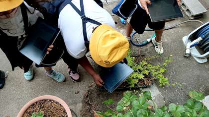 タブレットを持って中庭に来ていた子どもたちでしたが、育てているミニトマトの観察かと思いきや、植え込みや植木鉢の下などを探って写真を撮っていました。その被写体の正体は「ダンゴムシ」でした。