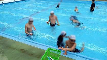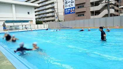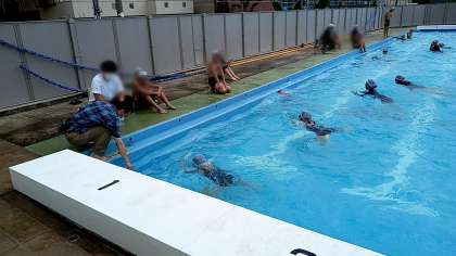 水慣れやプールの横を使った泳ぎの練習の後、小学校のプールでは定番の「洗濯機(流れるプール)」や「宝さがし」で楽しみました。