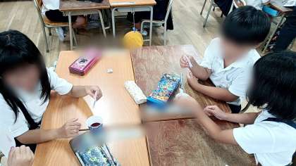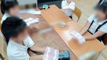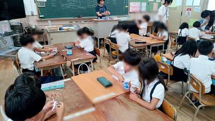 7/11 1年 図画工作科 公開日 2024/07/11 更新日 2024/07/11 お知らせ 1年生は、生活科で育てているアサガオを使って、染め紙をしていました。 花びらを使って色水を作り、その色水を折っている和紙に染みこませます。その和紙を開くと、同じ形が規則的に連なって、きれいな模様になります。 作った作品を嬉しそうに友だちや先生に見せる子もいて、みんなとても楽しそうでした。 いいね(0)