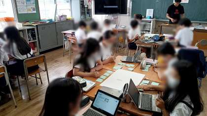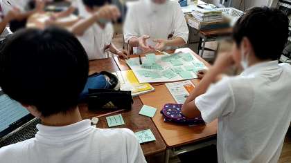 各グループで決めた季節について、季語(季節を表す言葉)になりそうな言葉を付箋に書いて出し合い、さらに関連のある言葉をグループ化したり繋いだりしていました。こうすると、実際に俳句を作るときに、頭の中のアイデアが整理され、俳句自体がより具体化されます。