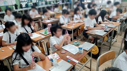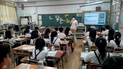 以前は、一定の濃度のフッ化ナトリウムを含む溶液で1分間ぶくぶくうがいをしていましたが、現在は「咀嚼(そしゃく)チェックガム」の使用しています。それにより、むし歯予防に加え、唾液の働きや噛むことの大切さについて学ぶことができるようになりました。