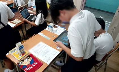 子どもたちは、咀嚼チェックガムを60秒間噛んだ後、QRコードが付いた台紙にガムを乗せてタブレットで撮影し、10段階判定の自分の咀嚼(噛み)具合をチェックしていました。