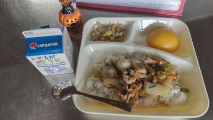 今日の献立は ・中華丼 ・もやしとコーンのごまいため ・黄桃(缶) ・牛乳 です
