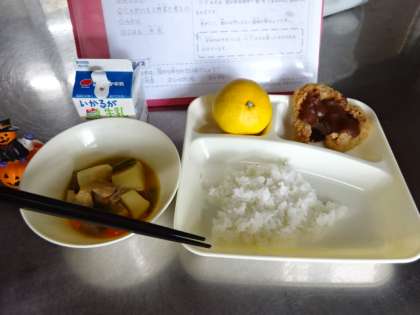 今日の献立は ・みそカツ ・じゃがいもと野菜の煮もの ・みかん ・ごはん ・牛乳 です