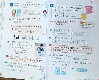 2年生の算数は「水のかさ」です。水のかさをたし算やひき算で計算していました。