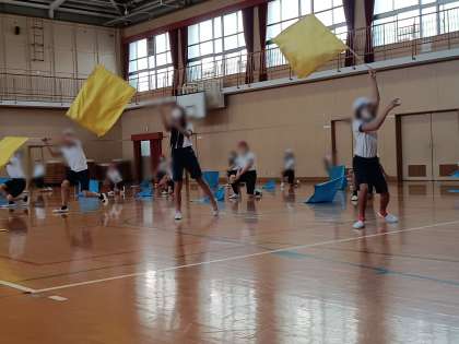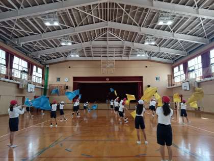 今年の団体演技(団演)はフラッグを使っての演技で、先生の指導のもと、みんな軽快にフラッグをなびかせていました。