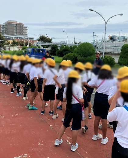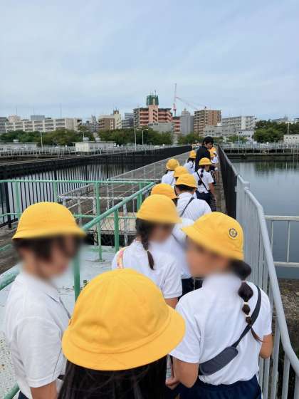職員の方の引率のもと、浄水場の様々な施設を見学しています。