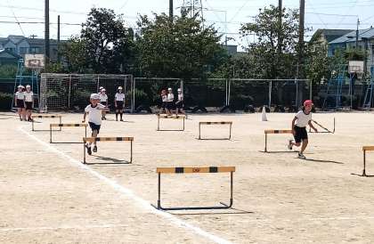 5年生の体育は「ハードル走」です。自分にあったコースを選んで練習し、後半は、タイムを測定しました。