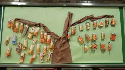 10月の玄関前の掲示板は、かわいい「ミノムシ」がたくさんぶら下がっています。