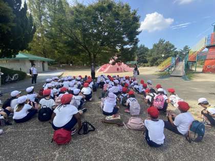 10/2 秋の遠足(1・2年) 公開日 2024/10/02 更新日 2024/10/02 お知らせ 1年生と2年生は、本日、秋の遠足で「大泉緑地」へ行きました。 10月とは思えないほどの暑さでしたが、子どもたちは広い公園内をがんばって歩きました。 公園では、大滑り台などの遊具で遊んだり、友だちと楽しくお弁当を食べたり、どんぐりを拾いながら歩いたりと、秋の一日をめいっぱい楽しむことができました。 いいね(0)