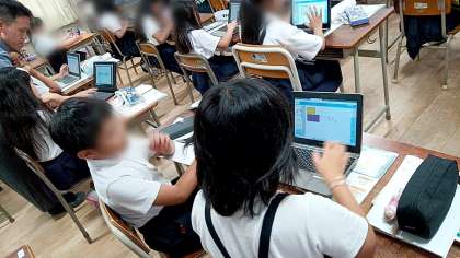 子どもたちは、タブレット上の発表ノートに描いてある図形の面積を、補助線を入れたり色で分けたりしながら面積を求め、求める式や自分の考えを文字で入力していました。