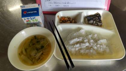 今日の献立は ・さごしのごまじょうゆかけ ・すまし汁 ・大豆の煮もの ・ごはん ・牛乳 です