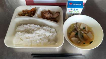 今日の献立は ・鶏肉の梅風味焼き ・うすくず汁 ・きんぴらごぼう ・ごはん ・牛乳 です