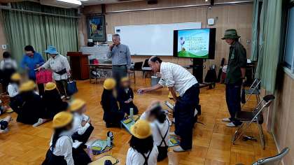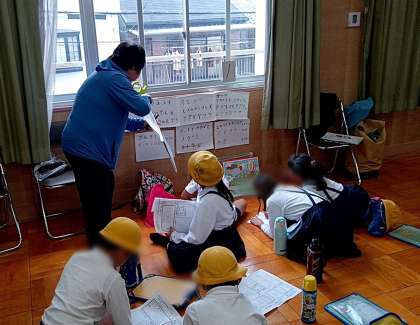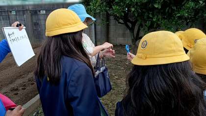 講師の方の簡単な説明の後、子どもたちはグループごとに中庭や学習園を中心に虫や植物を探しました。その後は見つけた生き物をグループで整理し、見つけた生き物の名前などをワークシートに書きこみ、みんなで確認しました。