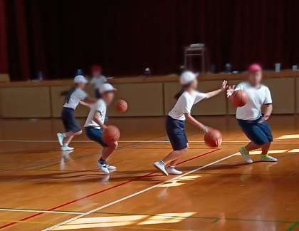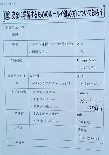 体育館では、バスケットボールをしていました。上の写真の掲示物は、この日のめあてを明確にして、子どもたちが1時間の授業の流れを確認できるようになっていました。また、運動中のBGM(※)は、子どもたちの運動意欲やリラックス効果を高めます。さらに、学習課題ごとに曲を変えることで次の課題へとスムーズに移行できます。子どもたちは、この流れに沿って、ウォーミングアップ(なわとび運動)からバスケットボールの基本練習へと取り組んでいきました。