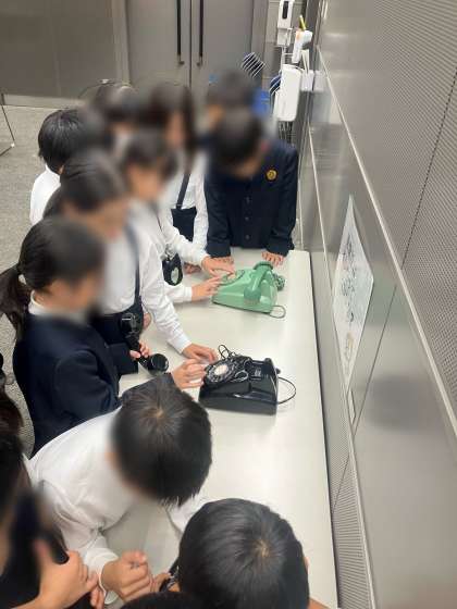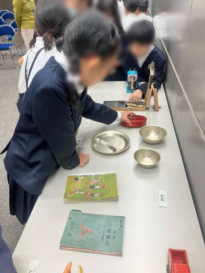 目的地に着いた子どもたちの最初の活動は、体験学習です。昔使われていた道具や文具などを実際に触ることができます。