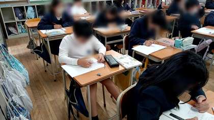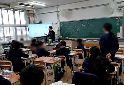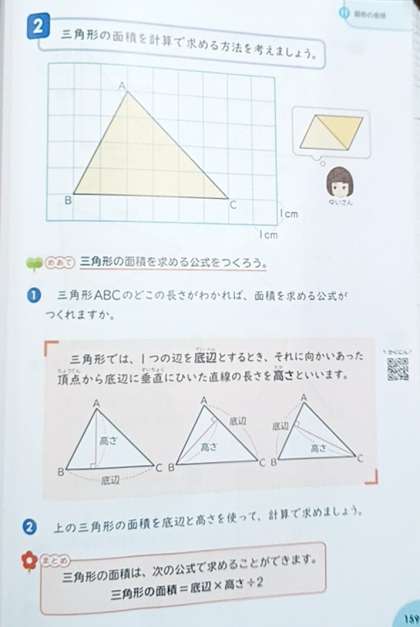 5年生の算数は「図形の面積」です。三角形の面積の求め方を学習していました。