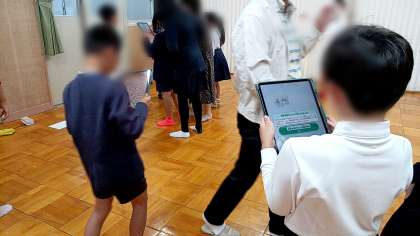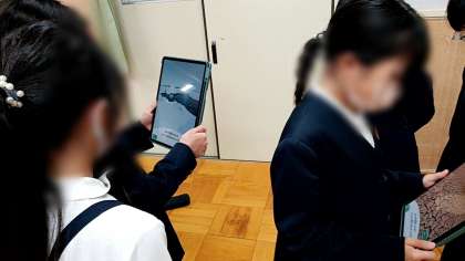 授業では、9月に行われた3年生と同じく、タブレットを使ったAR(拡張現実)体験がメインで行われました。子どもたちは、地球温暖化による森林の砂漠化や南極の氷が解ける様子、台風による大雨で大阪(道頓堀)が洪水に見舞われる様子など、目の前で実際に起こっているように感じるこの不思議な体験にとても驚いていました。