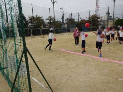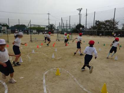 写真は、運動場のポイントにある種目で、上から「的当て」「ジグザグ走」「しっぽとり」です。