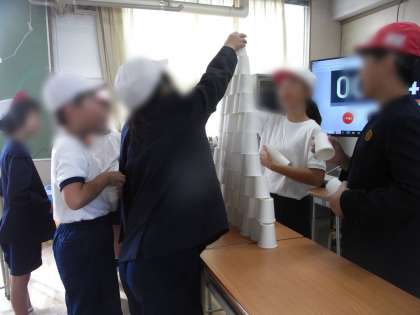 写真はその一部で、上から「テーブルカーリング」「紙コップタワー」「じんとりゲーム」のようすです。みんな、本当に楽しそうでした。