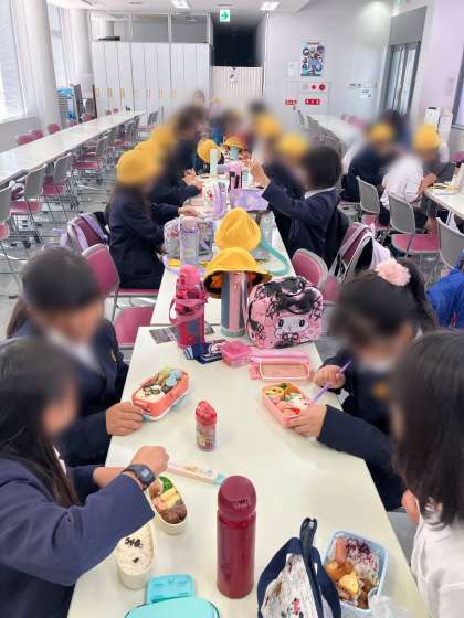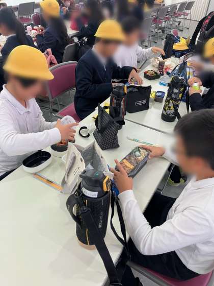 4年生の社会見学(科学館)のようすです。午前中のプログラムが終わり、お弁当タイムに入っています。