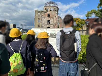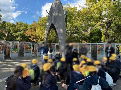公園での活動は、原爆ドームの見学、記念写真の撮影と進み、原爆の子の像の前で平和集会を行いました。子どもたちは、平和への思いを発表した後、全校児童で作った千羽鶴を折り鶴ブースに捧げました。