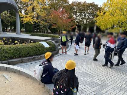 子どもたちはグループごとに、多くの外国人観光客で賑わう公園内を、数か所あるチェックポイントを目指して歩きました。